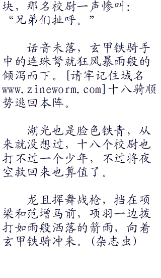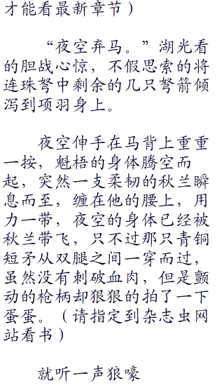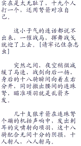 项羽嘴角露出一丝讥笑,正想一枪刺死夜空,一声尖锐的破空之声从脑后传来,玄甲铁骑装备的全是连珠弩,早在夜空出阵之前,湖光就做了准备,眼看夜空危机,不假思索就是一箭射来。