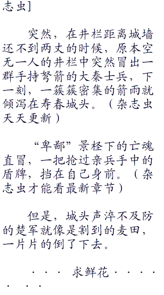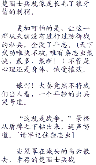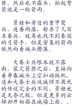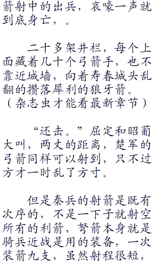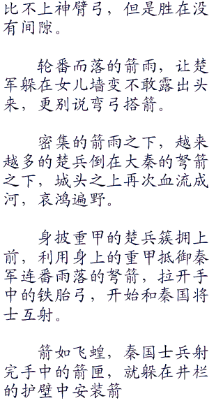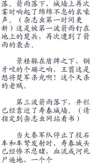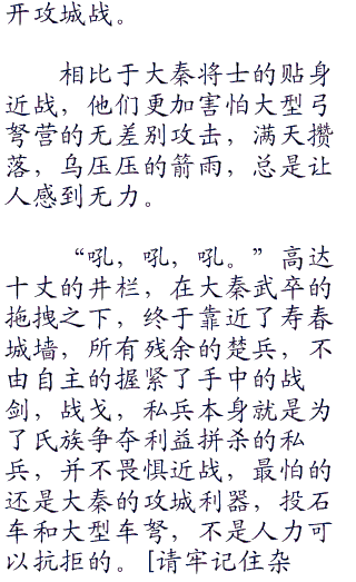 “砰砰”大秦士卒轮圆巨大的木槌,砸在车弩之上,密集的箭雨就像是一朵从天而降的黑云,带着尖锐的呼啸声向着寿春城头攒落。