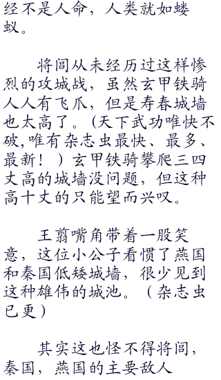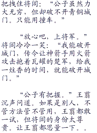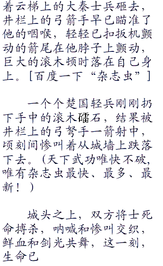 只不过,攻击才刚刚开始,随着井栏的发威,大秦将士已经叼着战剑,顺着云梯开始往上攀爬,脱去重甲身穿皮甲的勇士一个个就像是灵活的猿猴,飞快的爬上城墙。