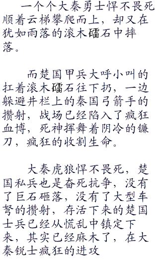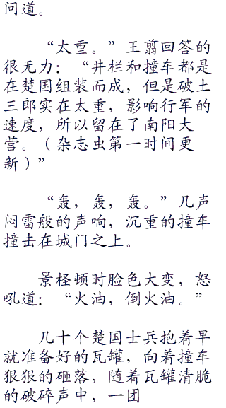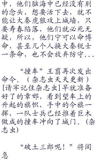 “闪开,让我砸死他们了”一个身材魁梧的楚兵扛着一截四五百斤的滚木,向