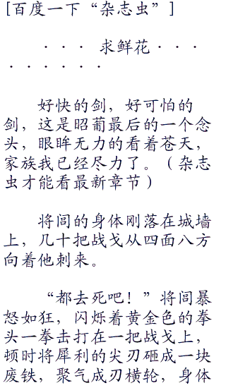“快,城里可是有二十万楚军,公子就是神功盖世,凭借一人之力也抵御不了这么多人。”王贲大吼,同时用战剑疯狂的拍打马臀,赵平也真急了,如果青龙上将军战死,恐怕自己就得抹脖子,想起公子的知遇之恩,赵平就眼角湿润。