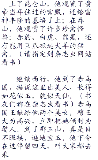 一路上,他经历了许多稀奇古怪、妙趣横生的人和事。他喜好打猎,在渗泽地方,他不但猎到了许多獐狍野鹿,还捕获了纯白色的银狐和纯黑色毛的貉;在30阳纡山下,为了祭奠水神河伯,他把珍贵的碧玉和猪、马、牛、羊沉入黄河,表示虔诚。