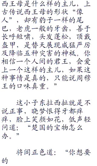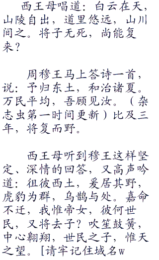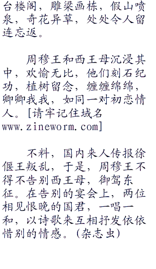 周穆王姓姬名满。他在位的时候,曾经周游天下,极为浪漫亦真亦幻,极富传奇色彩。据说他有八匹骏马,名字很古怪,叫做赤骥、盗骊、白义、逾轮、山子、渠黄、骅骝、绿耳。