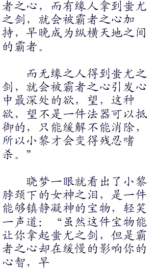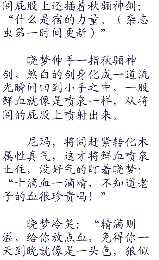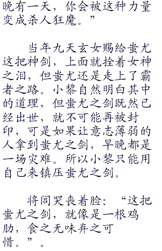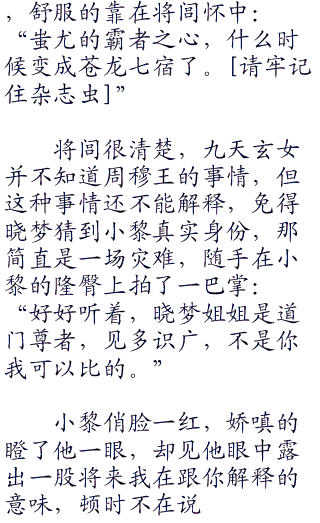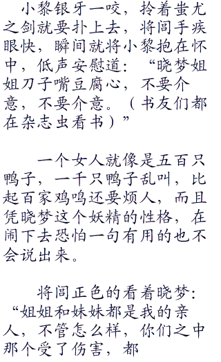 “小黎不要。”将闾惊恐大叫,不顾屁股上的剧痛,带着秋骊神剑从晓梦身上跃起,伸展双臂挡在杀气四溢的小黎身上:“晓梦姐姐是和我闹着玩的,不然就是有十个我,也得死了。”
