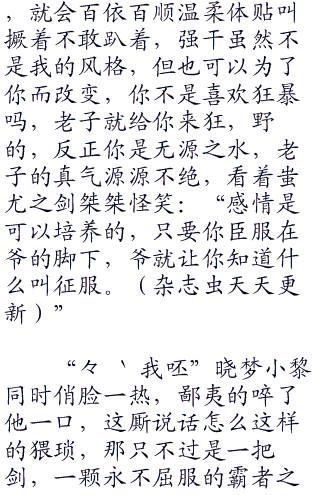 晓梦璀璨犹如钻石的眼眸撇了他一眼:“在卫庄手中蚩尤之剑就像是主人,卫庄就是它的奴隶,当然不用发