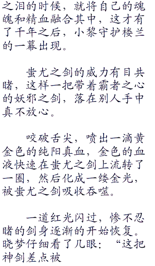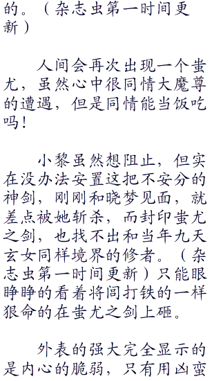 而小黎却是因为蚩尤之剑,是当年九天玄女亲手给蚩尤打造的,而蚩尤正是因为拥有了这把剑,才会从一个盖世的英雄变成一个强大的魔尊。心中总是有愧疚之情。