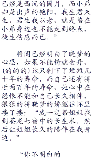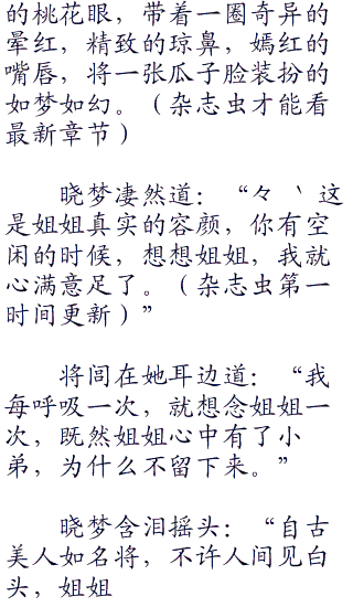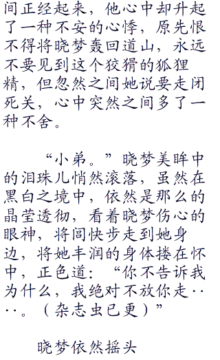 晓梦深深的凝视着他:“小弟,我要走了,临走之前有几句话要跟你说。”