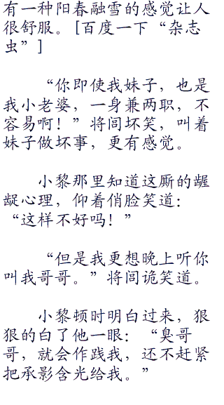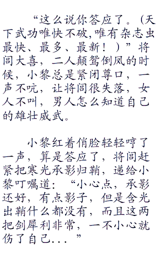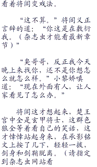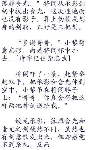 将闾神秘兮兮的一笑:“这把剑就像我一样,神秘而高贵,就算隐藏在暗室也是光彩照人,当年月神大人就这么夸过我,但是我知道她说的不对,像我这种“零零零”英俊非凡的主儿,怎么可以用光彩照人来形容。我就像是天空中的繁星,神秘而悠远,默默的看着来自楼兰的少女,自动投怀送抱。”