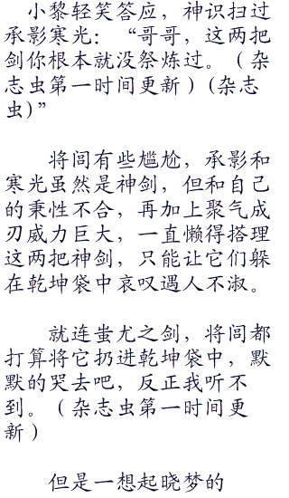 将闾一怕额头,我日,光想着蚩尤之剑难看了,蛟龙承影还没送给小黎,赶紧从乾坤袋中召唤出承影,递给小黎。