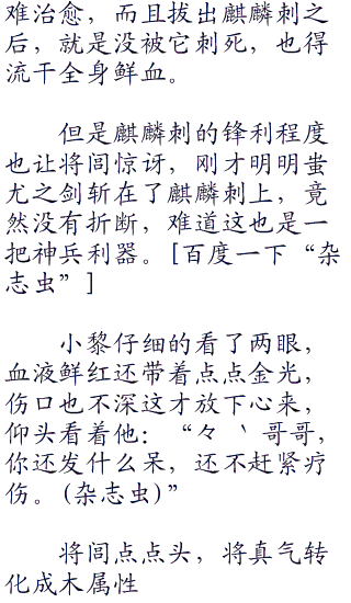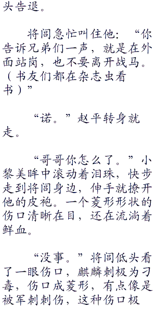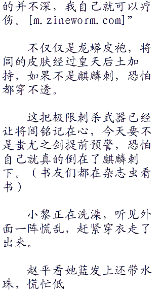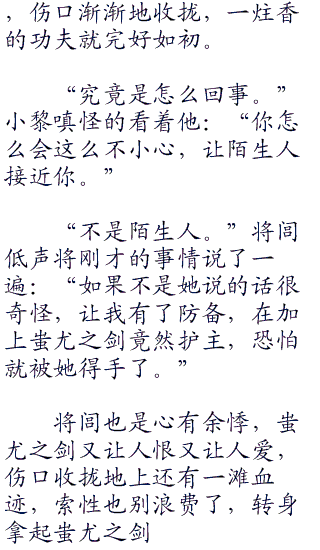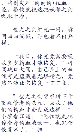 “赵平回来吧!我没事。”将闾笑道。低头看了一眼上空,突然发现蚩尤之剑竟然在偷偷的吸取自己的鲜血,随手就将它扔到了小几上。