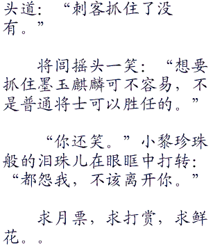 “这件事不要传扬出去。”将闾扭头看着湖光夜空:“你们两个带着一支千人队去军营保护上将军,半路上不许分开,而且要带着战马,刺客可以骗过人的眼睛,但是身上的气味却骗不过战马,一旦发现战马惊恐不安,不管那个人是谁,马上射杀。而且告诉大司命,三女不许分开。”