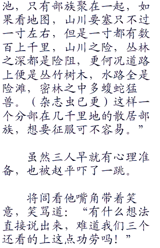 赵平摇头一笑:“棠溪在江东之西,就是楚人也对百越了解不深,百越之族,都是未曾王化的蛮夷,居住在山野密林,或者是大川河畔以渔猎为生的部族,分布在江汉山川,江南岭南和吴越一带。这里江河湖泊辽阔,崇山峻岭“零零零”连绵不绝,密林深邃河流纵横。