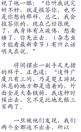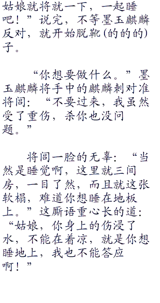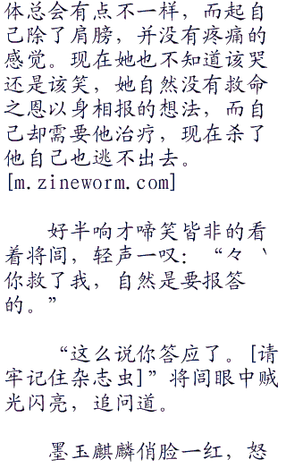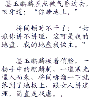 墨玉麒麟实在无语,这种想法很奇葩很怪异更让人羞愤,以至于她呆在那里再也说不出话来。