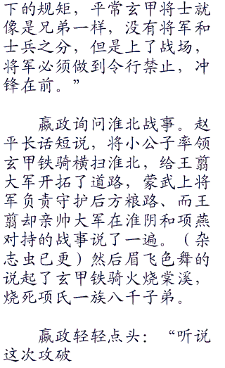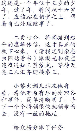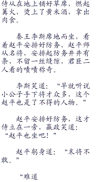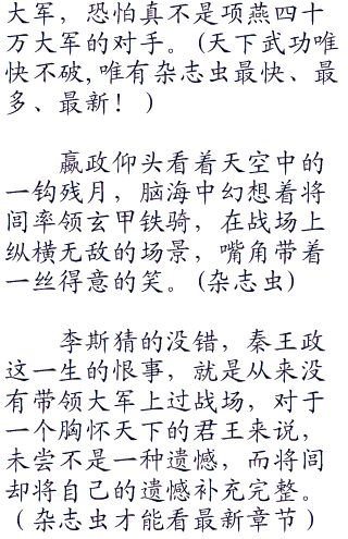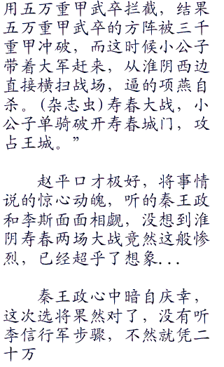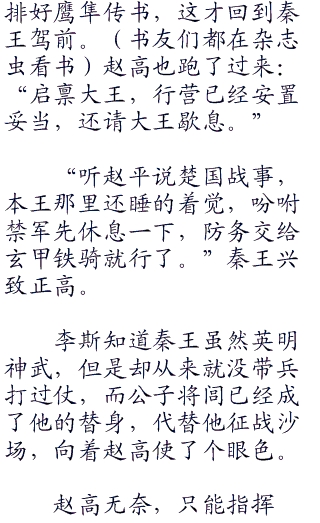 秦王政和李斯大笑,秦王道:“将闾还是太小心了,你去通知他吧!让他伙同两位上将军明天一早在接驾,不必连夜赶来,至于你一会儿给孤详细说说楚国战事。”