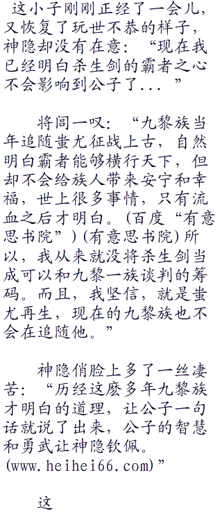 神隐感觉到了将闾的诚意,坦言道:“过去并不代表什么,这位姑娘虽然来自楼兰,但九黎一族已经远离故地,时间已经冲散了一切。将军手中的杀生剑,对九黎来说也只是一件圣物而已,就像是神隐斗篷和麒麟刺,它们虽然珍贵但也比不上我二十万的族人。现在是乱世,九黎族也要生存下去,所以,九黎一族可以和公子合作。