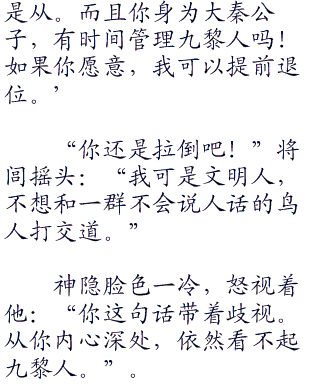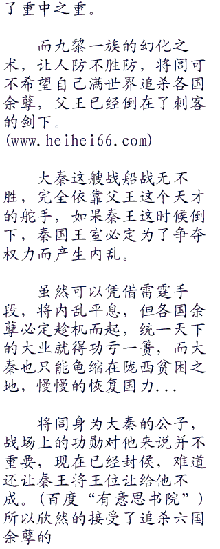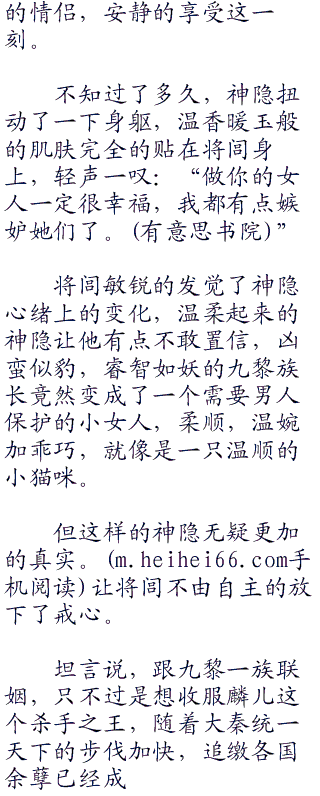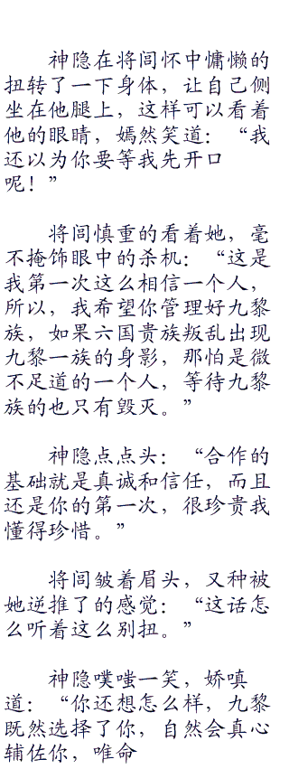身为九黎一族的族长,肩负着带着族人走出阴暗角落的重任。和楚国的政客,丛林中的百越人斗智斗力,在坚强的女人也会感觉到累,也想找一个坚强的臂膀让自己可以放心的依靠。如果可以,她真想这样坐到永远,但偏偏这个大秦的公子是侄女选择的夫婿。