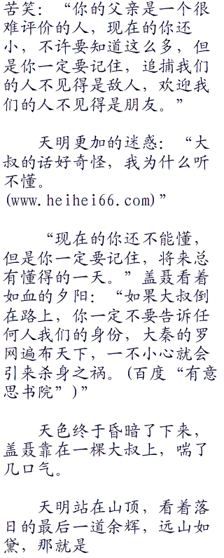 盖聂转过身来,一双依旧冷冽的眸光看着天明:“天明,不管路有多远,大叔走不走的到,你的目标都是燕地。