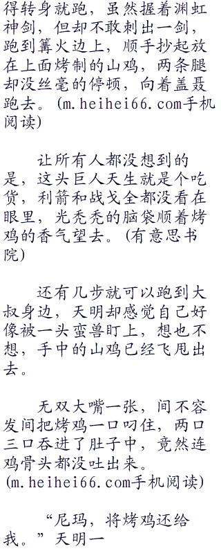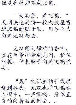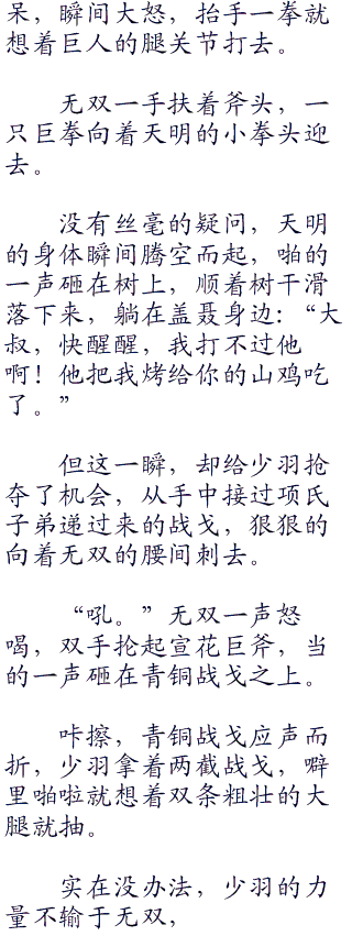 众人仰头看着狗熊飞空而过,心中还在庆幸这巨大的斧头没落在自己身上,就听少羽大叫:“小心身后。”