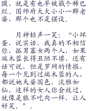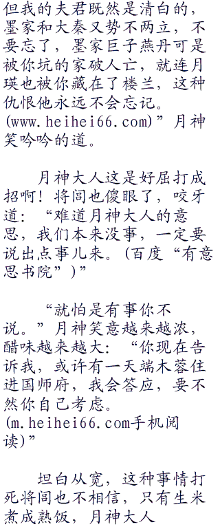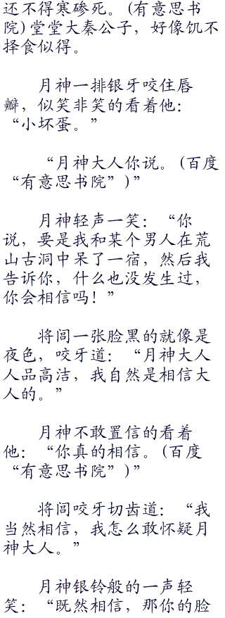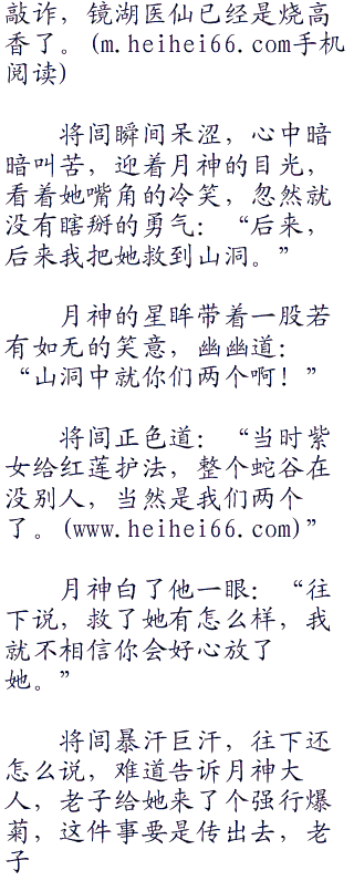 反正早晚的摊牌,将闾索性也不要脸了,从阳翟被荆轲偷袭,怎么认识的红莲,紫女,弄玉,为了毒杀姬无夜,深入蛇谷,自己手持狼牙匕首,斩毒蛇烧尸神咒蛊,英雄就美女的伟大事迹跟月神说了出来。