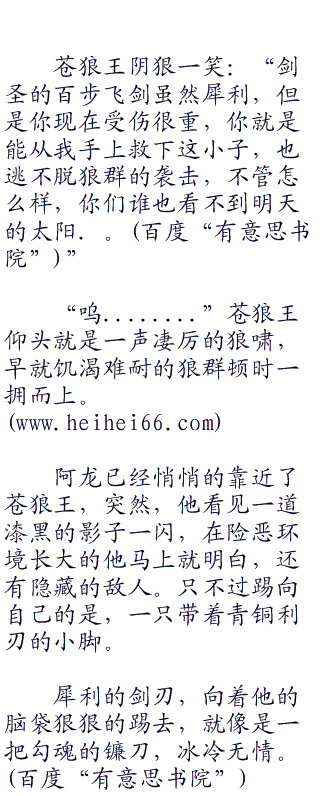 阿龙已经慢慢的靠近了苍狼王,野兽的直觉让苍狼王身体一动,随即就停止下来,盖聂的百步飞剑可是疾如闪电,扭头的瞬间就可以夺取自己的生命。而让他感觉到安心的是,背后已经多了一个人。一个可以保护自己后背的人。