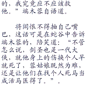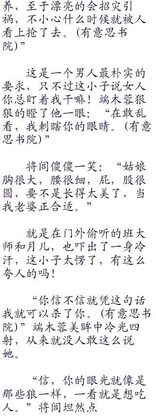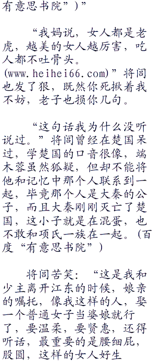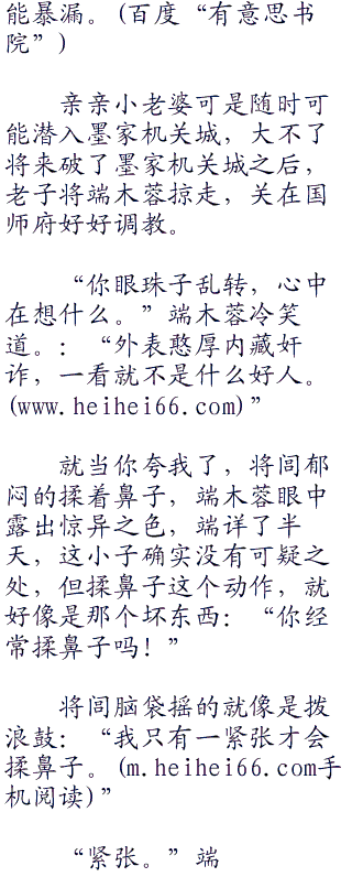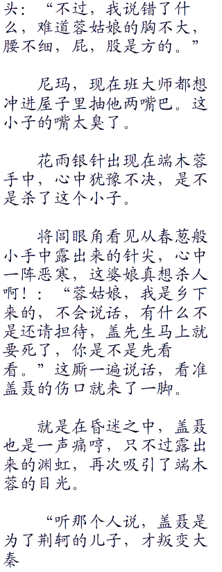 端木蓉绝对没有认出自己,这一点将闾可以肯定,毕竟麟儿的易容术天下无双。可问题是端木蓉为什么跟自己较上劲儿了。好像自己并没有露出什么破绽啊!