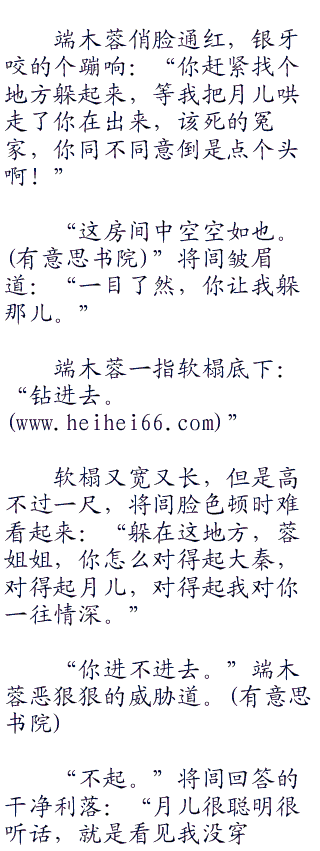 “啊”端木蓉惊慌失措的看着将闾:“你快穿上衣服”这才想起,刚才光顾这说话,衣服还没缝制好。眼波流转,看向了旁边的软榻:“你,你快躲进去,不要让月儿看见。”