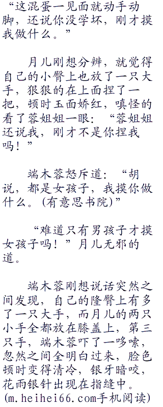 一大一小两个美女在软榻边上排排坐,隐藏在衣裙中的两座粉臀,就连那美妙的曲线也显露无疑,将闾一颗心都骚骚的。就听端木蓉又道:“这个大混蛋妻妾众多,那一个都是国色天香,而且看见女人就走不动路,月儿将来长大了也是美女,一定严防死守不让他占到便宜。”