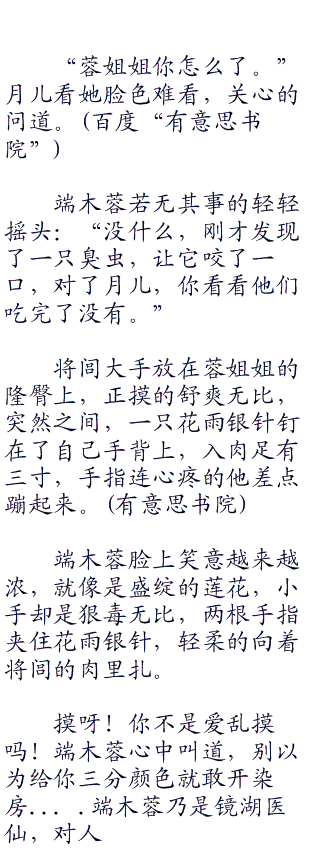 端木蓉不留痕迹的在月儿身边坐下,一颗心好像要从嗓子眼跳出来,强自镇定道:“月儿,你年纪还小,喜欢大哥哥可以,但是一定要注意分寸。”