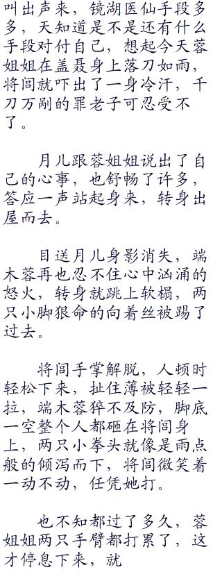 将闾现在也含糊起来,一个是不肯当老婆,但心中却向着自己的镜湖医仙,一个是老婆的女儿,都是发展婚外恋的对象,要不搞出点奸情让老婆捉捉奸,简直是上对不起道祖下对不起父母。