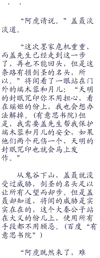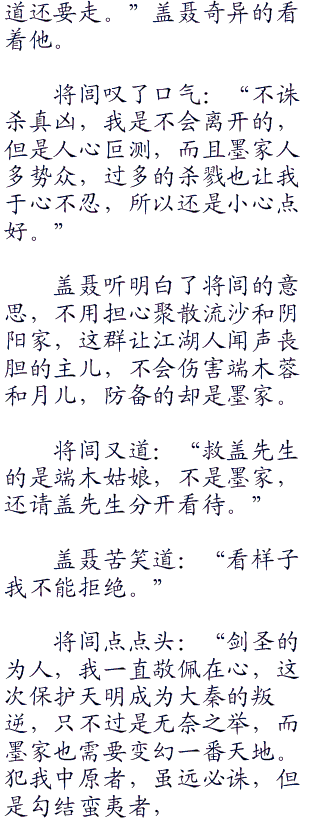 盖聂也有些惆怅,楼兰一别,在见面已经是死敌,而这个少年却又和天明有千丝万缕的关系,想起那两颗亮如星辰的眼眸,不由自主的叹了口气。