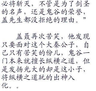 盖聂叹了口气:“第一次见面他还是一个少年,那时候就能抵御我的目光,第二次见面他已经能和我平等的战斗,这是一个少年奇才,也是最可怕的对手,在过几年恐怕连我都不是他的对手。”