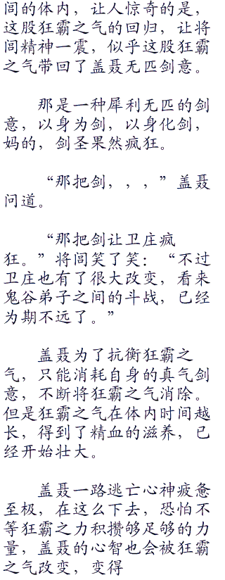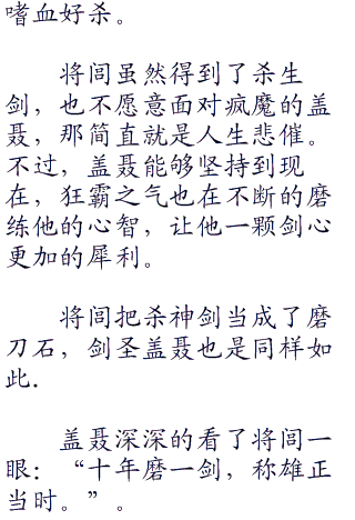 黎明时分,将闾还在酣睡,反正盖聂身上疼,就让他守夜了,有了剑圣的守护,将闾睡的无比香甜。