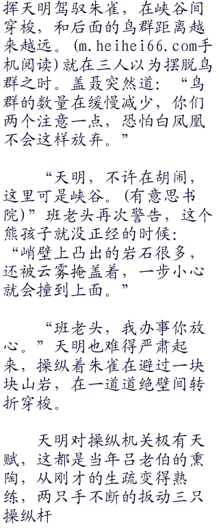 “班老头,不用这么小心我,我比你靠谱多了。”天明扳动操纵杆,朱雀头部下倾,穿过下方层层的云雾,进入一条峡谷,沿着绝壁急速飞行。