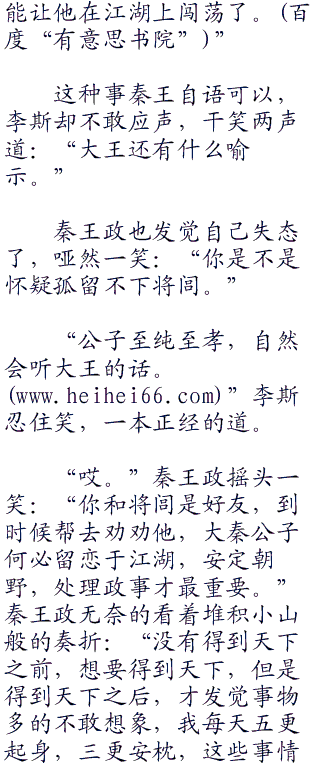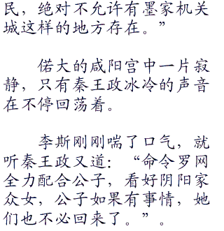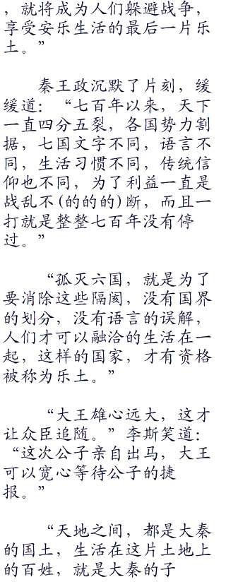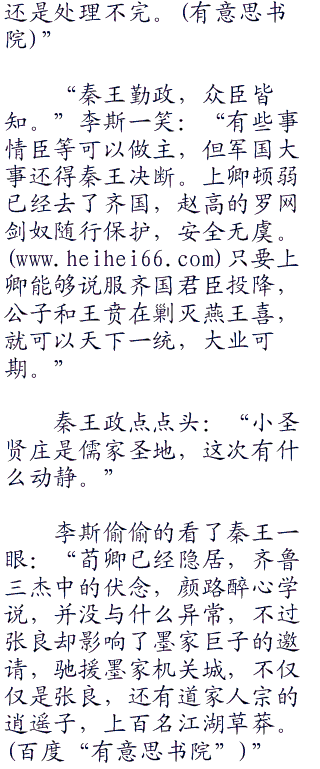 “大王不必忧心,具月神回报,墨家机关城隐藏的都是一些冥顽不化的江湖人,为了封侯拜相才追随墨家巨子,联合燕王喜残部叛乱,但是大秦在燕境施行的律法已经初见成效,黎民百姓已经不将自己当成燕国人,以成为秦人为自豪,所以燕王喜精心策划的叛乱,没有得的黎民的响应,只靠一些江湖草莽成不了大事。”李斯不紧不慢的道。