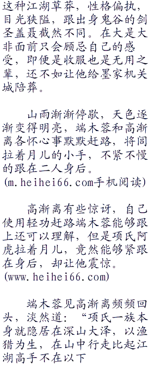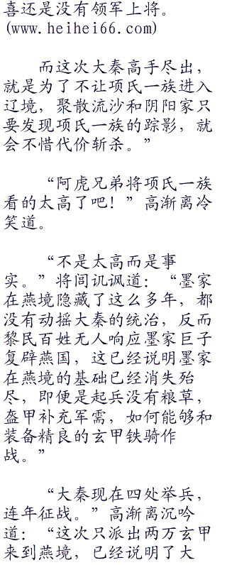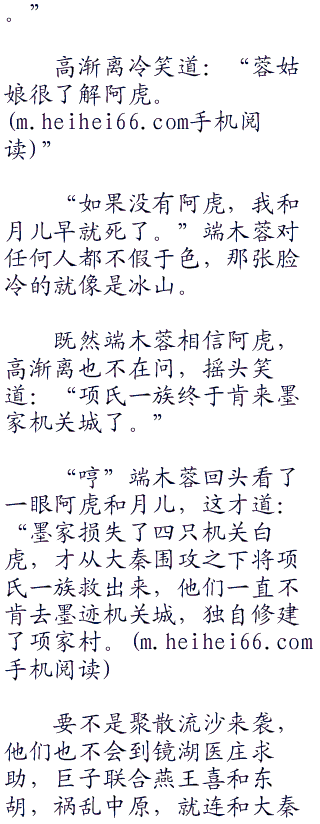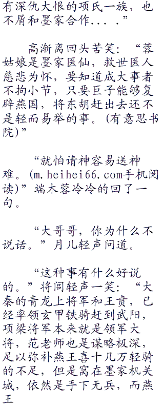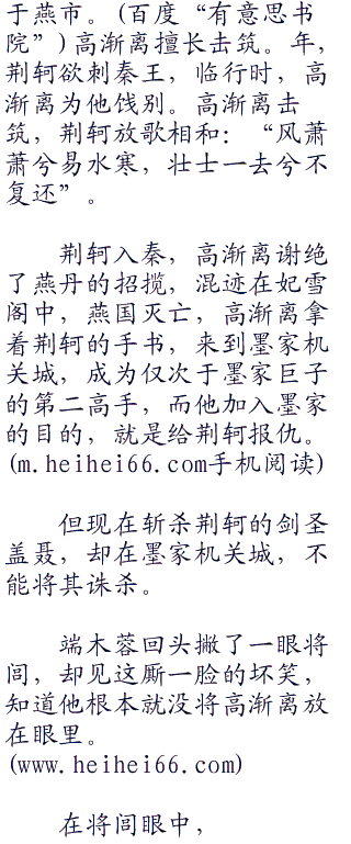 高渐离说:“荆轲,别去咸阳了,回墨家机关城吧,那是一个与世无争的地方。那里没有纷争没有仇杀没有动荡,只有安宁幸福。”