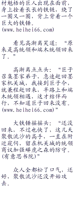 高渐离和端木蓉使用轻功赶路,将闾抱着高月迈开双腿,奔行急速,旁晚时分赶到了墨家机关城。
