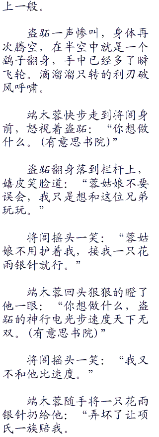 将闾横跨一步,就堵住了盗跖:“看你贼眉鼠眼的,一看就不知道是什么好人,离蓉姑娘远点。”