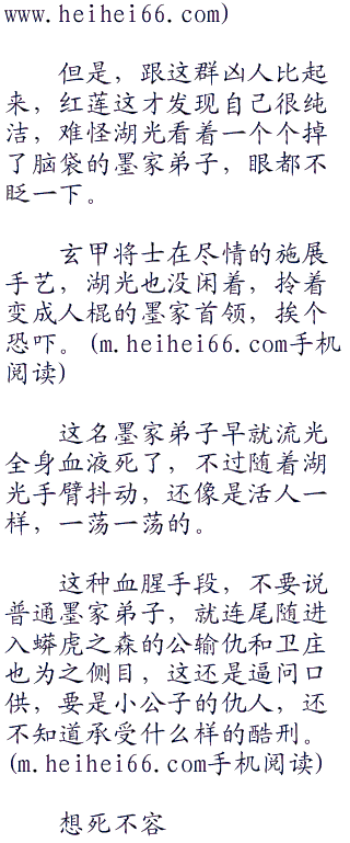 “不用胆小,我给你们变个戏法。”墨家弟子哭爹喊娘,可是没叫几声就再也叫不出来了,湖光麻利的斩断他两条腿,然后就是两条胳膊,将他变成了一个人棍。
