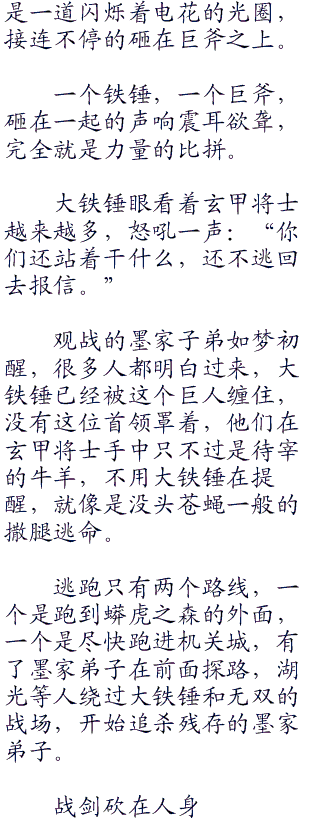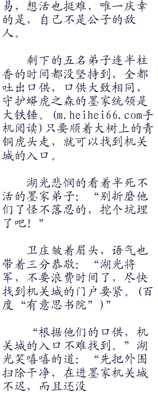 看到湖光一眼不发就肢解了一个首领,几个墨家弟子全都崩溃了,立刻交代出机关城门户的位置。