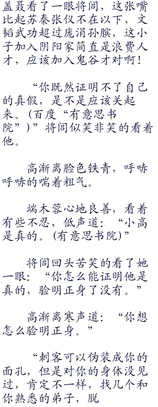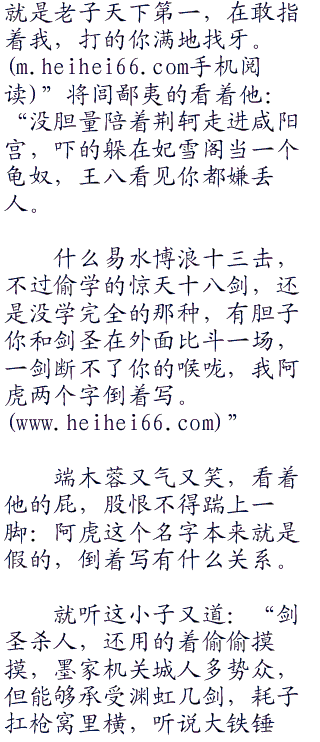 “我在说你就是一个小人。”将闾鄙夷一笑:“一个是非不分,被仇恨冲昏了头脑的混蛋,不用这么看着我,你的水寒剑虽然犀利,也快不过渊虹,盖聂想杀你,眨眼间的事。