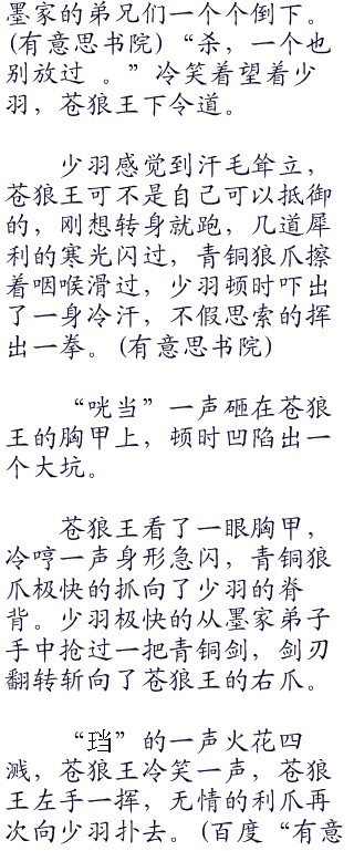 一声恐怖的狼啸,一声凄厉的惨叫,一名墨家弟子倒在了血泊之中,接着一道清风扫过,少羽急速的回头,眼孔急速的收缩,竟然遇见了熟人。