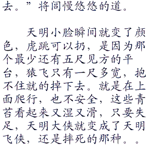 飞跃虎跳,天明并没有费力气,但是被老子这样扔来扔去,早已被这一连串的惊险动作下的浑身哆嗦,一屁,股坐在地上,大口的喘着粗气。
