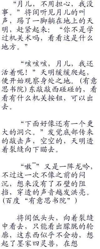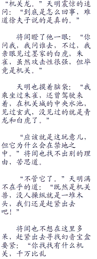 “月儿,墨家禁地真的有龙。”将闾也是感到狐疑,龙这种东西只是存在于传说之中,但是一条机关龙,怎么会叫。