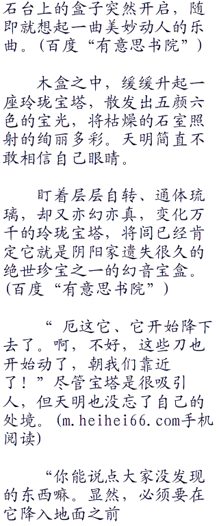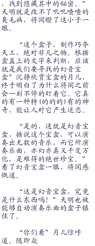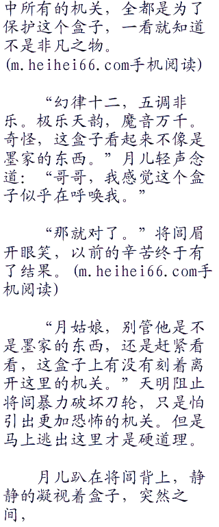 听见天明的话,将闾也看向了突然出现的盒子,虽然月神使用占星术占卜到幻音宝盒就在墨家,但将闾总是半信半疑,抬头看了一眼在洞顶上站着的月儿,俏脸上是一种惊喜,那是一种久别重逢的喜悦。