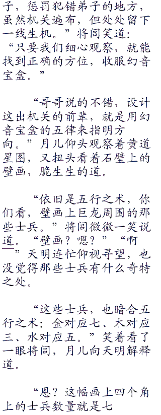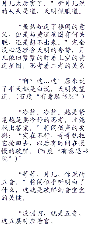 这小丫头了不得啊,这东西老子都认不出来,只能看出满天的星斗,将闾扭头道:“月儿,你是幻音宝盒的有缘人,只有你才能破解上面的秘密,用心灵和他沟通。”