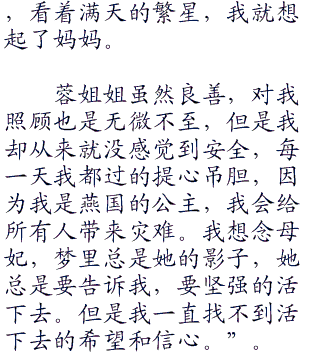 昨天晚上,将闾对着石碑沉思,不知不觉月儿坐在他怀中睡着了,月儿以为只是小睡了一会儿,谁知道一整夜过去了。
