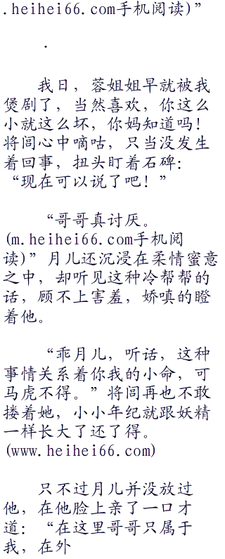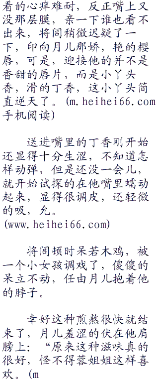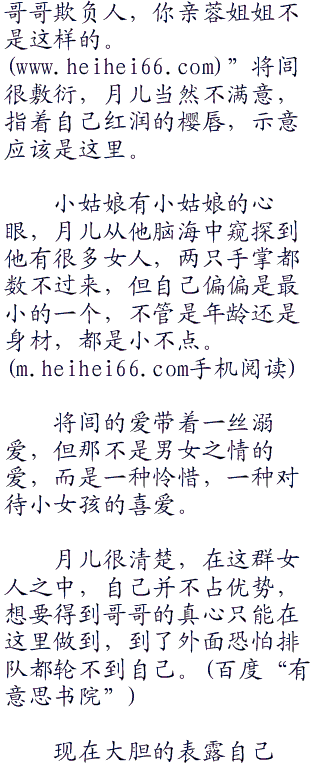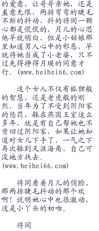 “我什么都不要。”月儿充满羞意的眼神看了他一眼:“我只要哥哥像亲蓉姐姐一样,也亲我一下。”说完将脸蛋埋在他肩膀上,在也不敢看他。