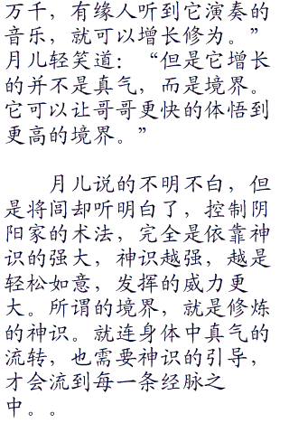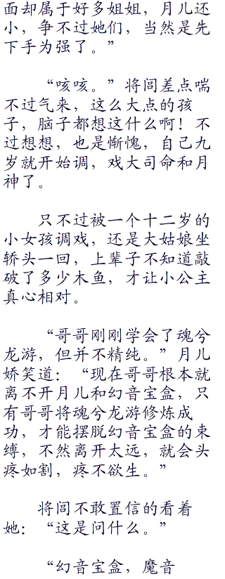 月儿轻声道:“幻音宝盒中不仅仅是记载着魂兮龙游的道决,还隐藏着一个大秘密,可惜我修为不足,不能窥探到其中的奥妙,我想阴阳家也是在追寻这个秘密,所以才不遗余力的寻找这件奇珍。”