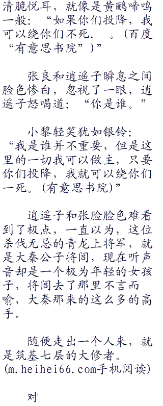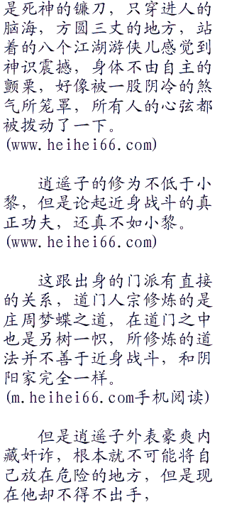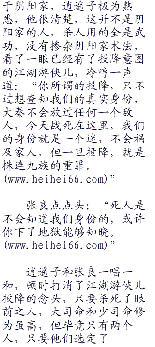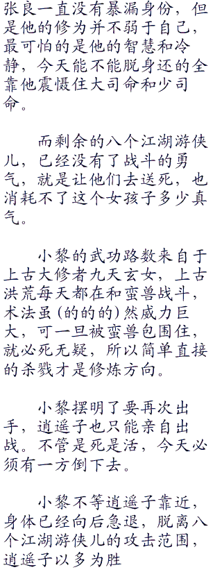 小黎现在虽然沉静如斯,看不出一点异样,但不管是谁,杀了这么多人绝不好受,这也是张良和逍遥子需要的效果,高手过招,刹那之间的分神,就可以决定生死。