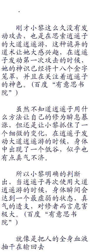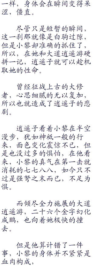 手指更是在虚空中连画,北冥有鱼,其名为鲲。鲲之大,不知其几千里也。化而为鸟,其名为鹏。刻画到这里,手法有些呆涩,整篇的大道逍遥游,逍遥子也力所未逮。